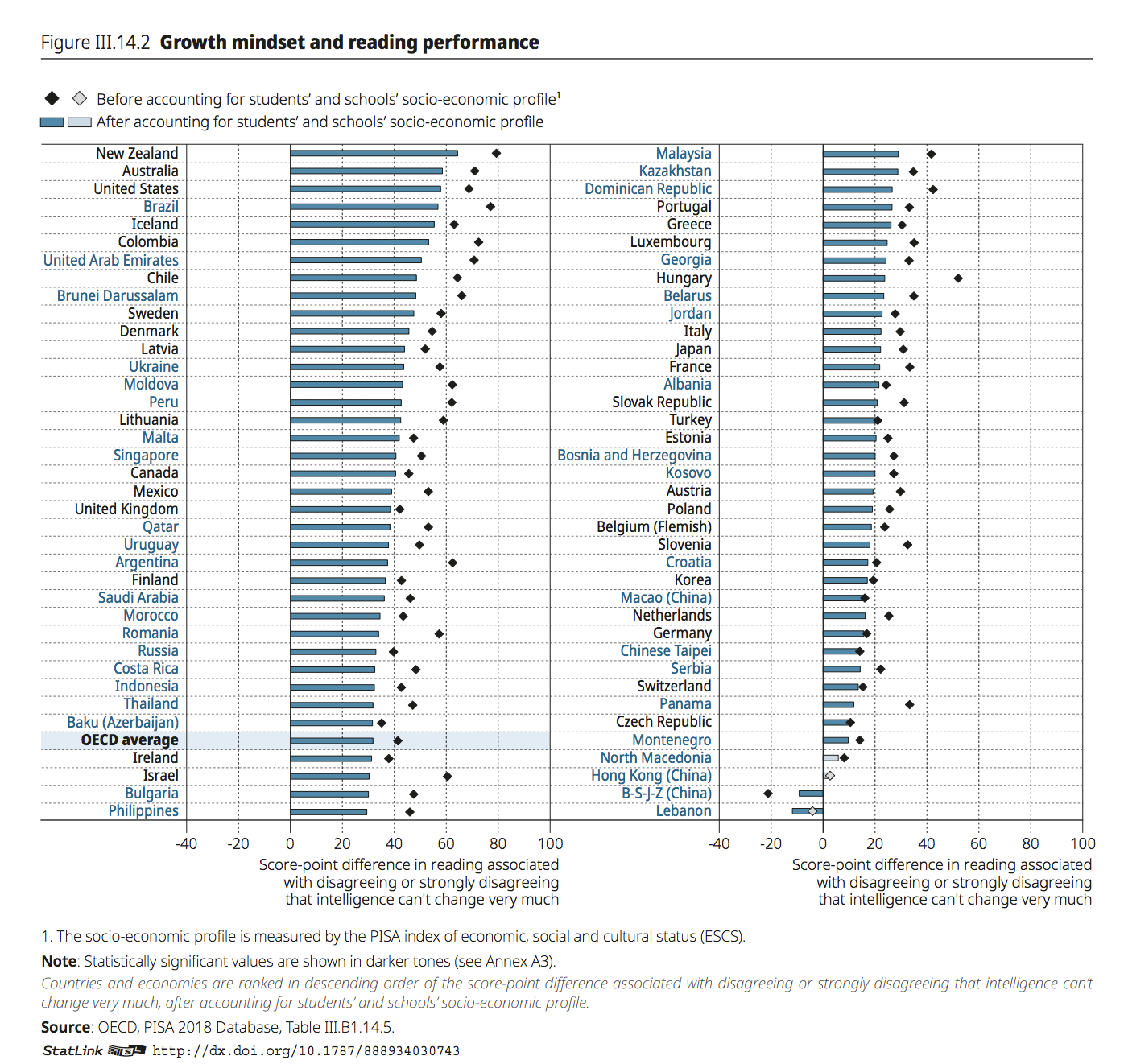 While, on average across OECD countries, students with a growth mindset scored 32 points higher in reading than students with a fixed mindset, the difference in scores between the two groups of students was 22 points in Japan, 17 points in Korea and Macao (China) and 15 points in Chinese Taipei. (OECD, 2019, p. 203).