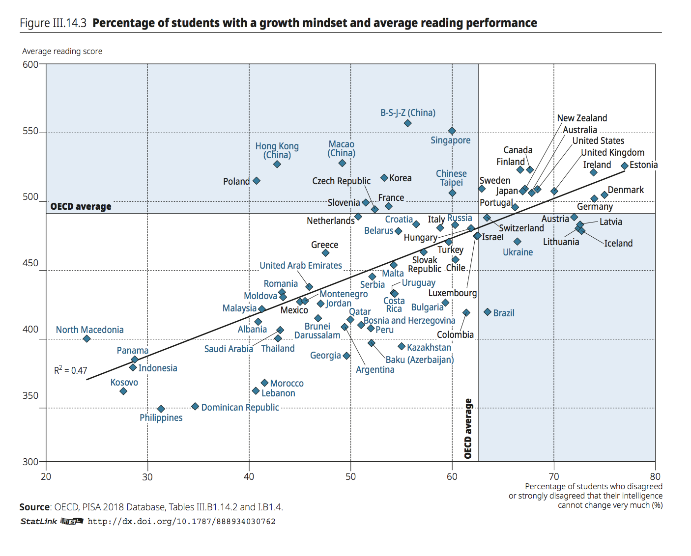 The overall relationship between percentage of students holding a growth mindset and reading scores is very significant and positive (R2=0.47) across different education systems as shown in PISA’s Figure III 14.3.
